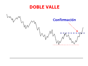 Doble valle: se produce cuando hay una tendencia bajista. Los mínimos son cada vez menores, pero si en un momento dado un mínimo no supera el mínimo anterior, esto es señal de que se puede producir un cambio de tendencia.